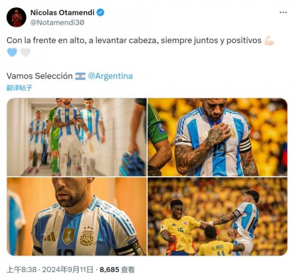 奥塔门迪在社交媒体上晒出比赛照片,并写道:“昂首挺胸,抬起头,永远团结一致,并保持积极的心态。加油,阿根廷队!”