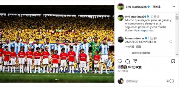 阿根廷门将马丁内斯在社交媒体上晒出首发球员的合照,并写道:“还有很多需要改进的地方,但我们的渴望和承诺一直都在。我们仍然排名第一并充满热情。”