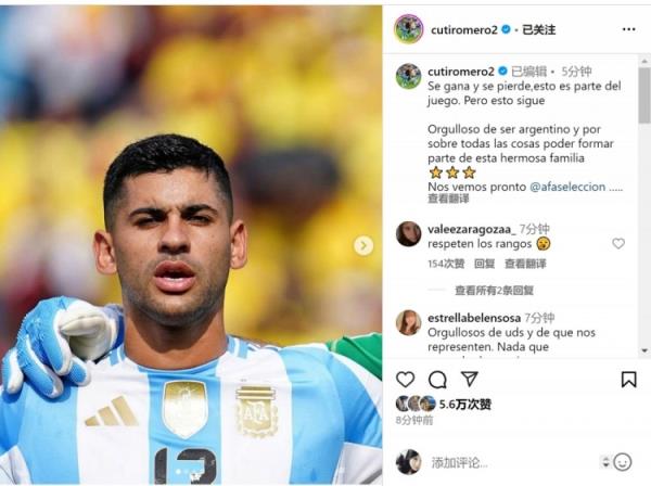 阿根廷中卫罗梅罗在社交媒体上晒出自己的照片,并写道:“有输有赢,这都是足球运动的一部分,但我们的征程还在继续。”
